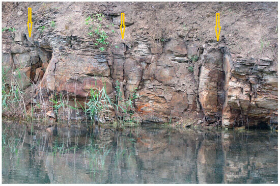 There was also an extreme drop in water salinity, identified by a decrease in the concentration of primary ions (Table 1). However, the hydrochemical type of the water did not change. It is still di-ionic chloride–sodium water (Cl–Na). This issue seemed interesting since reducing salinity in an endorheic settling basin is impossible without pumping its water out. Gliniok and Grunfeld (Figure 3) are located in the zone of a dense fault network in Carboniferous formations [18]. These faults are still active, and their displacement is observed on the surface and deep in the rock mass [19,20,21]. Additionally, mining activities in the area cause numerous seismic shocks, the energy of which may exceed 105 J, and the Upper Silesian Coal Basin area is one of the most seismic coal basins in the world [22]. These tremors in fault areas lead to numerous ground deformations, facilitating easier water migration into the rock mass. This type of situation also occurred in the case of the tested reservoirs. In the Upper Silesian Coal Basin, there are known cases of complete disappearance of small streams whose waters infiltrate the rock mass through a system of rock cracks (caused by mining exploitation) [23]. In the case of the Gliniok reservoir, brine infiltrated the rock mass through a system of numerous (shock-activated) cracks (fissures, Figure 12). The groundwater and rainwater flowing into the reservoir caused the remaining brine to dilute and meromixis to disappear. The reservoir receives 807 mm of precipitation annually. As the reservoir surface is approximately 12,200 m2, it gets an inflow of freshwater of ~10,000 m3.