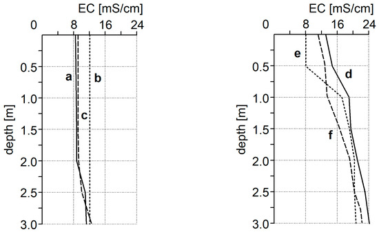 Electrical conductivity (EC) profiles of the “Hubertus I” reservoir: a—Autumn, 2008; b—Autumn, 2009; c—Spring, 2009; d—Winter, 2008; e—Summer, 2009; f—Winter, 2009.