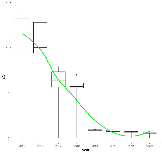 The current measurements of the physicochemical properties of the water’s vertical profile showed that meromixis had disappeared in the reservoir. It is particularly well illustrated by the distribution of electrolytic conductivity (Figure 10). Its significant decrease (up to approximately 2 mS/cm) and the lack of water stratification are visible. The temperature distribution is also different. In summers, the heliothermal water heating zone disappears; in winters, the water temperature at the bottom is about 5 °C (Figure 11).