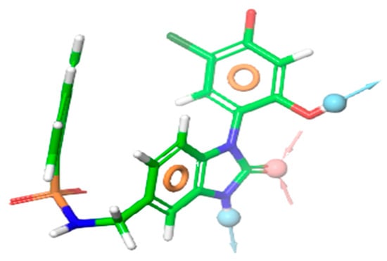 Pharmacophore model ADDRR: acceptor (red), donor (blue), and ring (orange) representation.