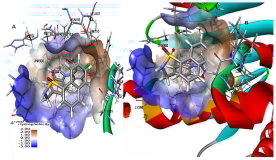The grid file required for docking was created using Glide’s grid-generating panel. The location of the cocrystallized ligand in the protein active site served as the basis for defining the grid’s center. Using BIOVIA Discovery Studio Visualizer (Dassault Systems, San Diego, CA, USA), the poses of the ligands with the most advantageous binding energies were displayed following the docking calculations in SP and XP modes.