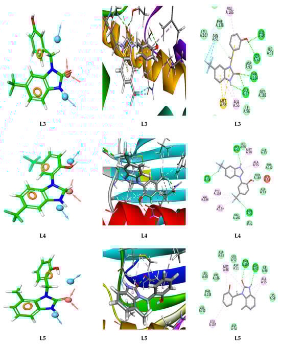 The ability of an active substance to inhibit certain enzymes is of crucial importance in the development of new drugs and in clinical applications. To better understand a compound’s pharmacokinetic characteristics and maximize its therapeutic application, it is important to determine which enzymes it inhibits. Based on the data in Table S5, all compounds may be potent cytochrome P450 (CYP) inhibitors. All compounds exhibited moderate renal clearance, with values ranging from 6.567 to 11.818. Compound L5 exhibited the highest value. With the exception of compound L4, which had a low value of 0.051, all compounds have an intermediate half-life (T1/2), ranging from 0.568 to 0.892. It is important to remember that drugs with short half-lives and poor clearance are generally excreted comparatively quickly [,].