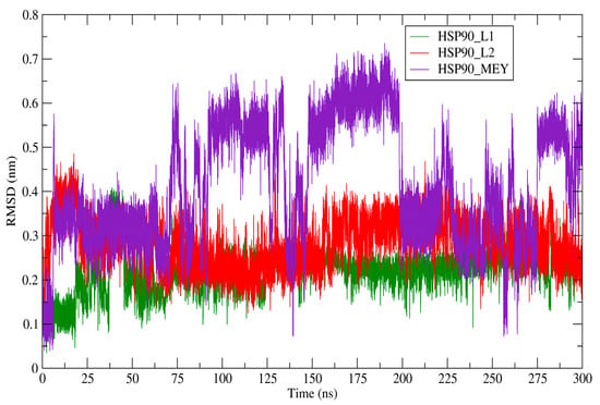According to the results of the molecular docking analysis and ADMET evaluations, three different complexes were submitted to all-atom molecular dynamics simulations: HSP90_L1, HSP90_L2, and HSP90_MEY as a reference complex. The three simulations were run at 300 ns with the CHARMM36 force field from the Gromacs-2023 program. The molecular topology data of the identified inhibitors and the reference drug (MEY) were derived from the SwissParam platform (http://swissparam.ch/ accessed on 10 June 2024) []. Additionally, the editconf function was used to create a simulation box on the complex with an absolute minimum distance of 10 Å to any wall. Furthermore, the intermolecular potential using the TIP3P water model was utilized to fill the box with solvent molecules with the application of the gmx solvate command []. The charge for each system was neutralized by the addition of (Na+, Cl−) ions. The steepest descent technique (1000 ps) for protein configuration was used to minimize the energy. For energy minimization, set nsteps to 50,000 were modified to an energy step size (emstep) of 0.01 []. NVT equilibration was conducted at 300 K for 500 ps using a V-rescale thermostat. The NPT was then adjusted for 100 ps using a Berenson pressure-coupling system and a coupling value of 2.0 ps. Finally, the MD simulation was performed at 300 ns for each system, using nsteps of 150,000,000 specified in the md.mdp data.