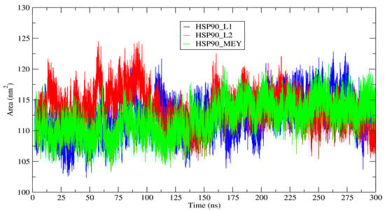 HSP90′s structural compactness was assessed using Rg. The results revealed that Rg values across all complexes exhibited slight variations, ranging from 1.707 to 1.739 nm. The average Rg values calculated for the HSP90_L1, HSP90_L2, and HSP90_MEY complexes were 1.724 nm, 1.739 nm, and 1.707 nm, respectively. The HSP90 configuration remained unchanged in the presence of the proposed inhibitors, maintaining a stable radius of gyration throughout the 300 ns simulation period, indicating the stability of all complexes. Figure 6 shows the radius of gyration. The solvent-accessible surface area (SASA) predicts the dynamic changes observed during the interaction time. Figure 7 shows SASA profiles for each system during 300 ns of simulation. The average solvent-accessible surface area for the reference system measured 111.869 nm2, while for the complexes HSP90_L1 and HSP90_L2, the average SASA values were 112.311 nm2 and 113.561 nm2, respectively. The SASA reached a stable equilibrium throughout the simulation, suggesting that the configurations of HSP90 remained stable in the presence of the proposed inhibitors (L1 and L2). This consistency helps elucidate how the proposed molecules interact with the active site of HSP90 and consistently bind during molecular binding.