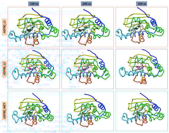 These findings align with previous research, specifically the docking study, which demonstrates that the proposed compounds form highly stable complexes with the HSP90 protein and effectively inhibit its crucial function. Moreover, snapshots of the three systems were taken at intervals of 100 to 300 ns. Analysis of the binding poses of each complex confirms their stability throughout the simulation period, as shown in Figure 8.