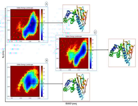 We analyzed the MD simulation results to gain understanding of the compactness, flexibility, and stability of the complexes that were produced. While the root mean square fluctuation (RMSF) was used to evaluate the flexibility of all residues, the root mean square deviation (RMSD) was used to determine the structural change of each system during 300 ns of simulation. Each complex’s compactness was ascertained using the radius of gyration (Rg). In order to assess the overall stability of the complexes that were generated, we also calculated the solvent-accessible surface area (SASA). To analyze the simulated trajectories, the Grace program (http://plasma-gate.weizmann.ac.il/Grace/ accessed on 12 June 2024) was used. Lastly, we used the free energy landscape (FEL) to investigate the systems’ molecular stability.
