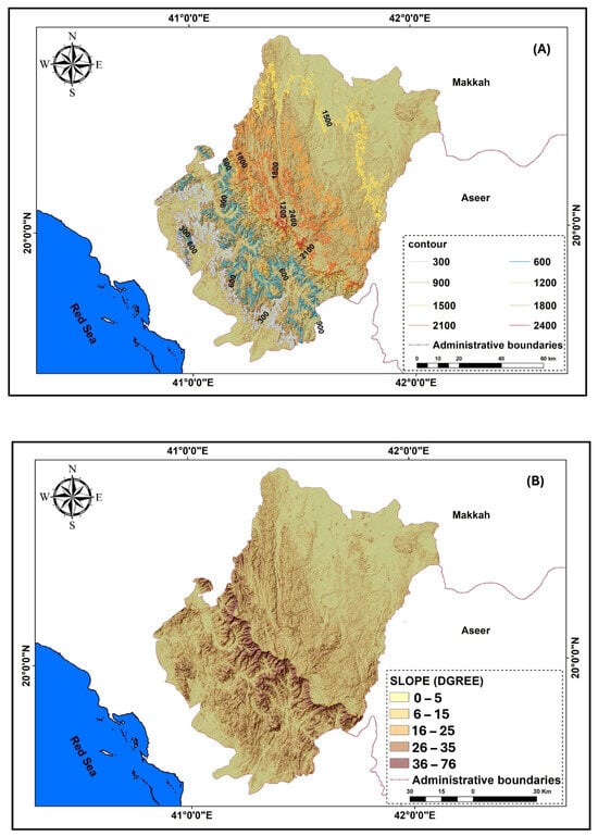 The study was conducted in the Al-Baha region, located in the southwestern part of Saudi Arabia within the Sarawat Mountains (20°00′45″ N, 41°27′55″ E). The region covers approximately 11,000 km2 and features varied topography, including the Tihama plains, highlands of the Sarawat Mountains, and the eastern mountains and plateaus. The Al-Baha region is bordered to the north and west by the administrative boundaries of the Makkah Al-Mukarramah region, and to the south and east by the administrative boundaries of the Asir region (Figure 1). These jurisdictional boundaries are provided to give readers a clear understanding of the study area’s geographic context and its administrative divisions, which influence land-use patterns, resource management, and the implementation of regional environmental policies.
