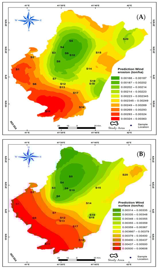 In the Al-Baha region, georeferenced data were gathered from 20 sites (S1 to S20). Wind speed, soil type, slope, surface roughness, and dust deposition rates (ton ha−1) were among the variables. Spatial data on land-use practices; topographical features; and meteorological parameters, such as wind speed and precipitation, were combined with field data on wind erosion and dust deposition. We used Geographic Information Systems (GISs) and the Kriging interpolation method to evaluate the susceptibility of several sites in the Al-Baha region to wind erosion, wind surface disturbance, and dust deposition. We were able to map and examine spatial changes throughout the research region thanks to this methodology, which gave us insights into the environmental factors influencing soil stability.