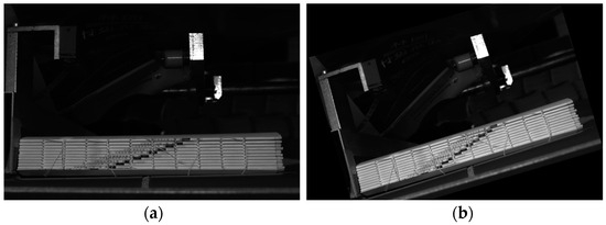 The dataset used in the experiment is a self-built one, collected from the production line of a printing factory using a CCD camera, with all images having a uniform resolution of 3072 × 2048. Since most of the book images collected from the production line come from the same batch of books, the similarity between the collected book images is extremely high, which is not conducive to model training. To address this issue, a large number of highly similar data samples were first eliminated. Subsequently, the labelImg annotation tool was used to accurately annotate the signature marks in the data. Finally, the annotated data was enhanced using a method that randomly combines eight types of image transformations, including horizontal or vertical flipping, mirror symmetry, affine transformation, rotation, adding Gaussian noise, contrast adjustment, scale transformation, and translation. The final dataset for training and validation contained 2739 images, covering 36,078 signature marks, and was divided into training, testing, and validation sets in a ratio of 7:2:1, as shown in Table 1. The sample examples before and after dataset augmentation are shown in Figure 2.