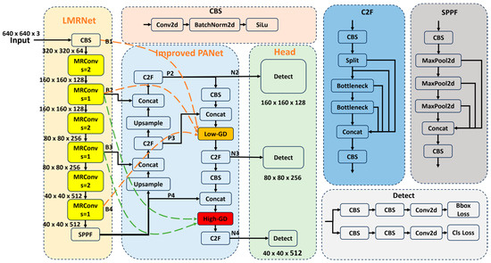 Secondly, we have made improvements to the PANet structure of the original YOLOv8 network by incorporating low-GD and high-GD modules. The low-GD module is responsible for aggregating and fusing the B1, B2, and B4 features output from the backbone network, while the high-GD module is responsible for aggregating and fusing the B2 and B3 features.