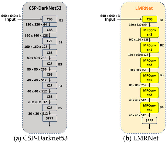 Different backbone network designs: (a) CSP-Darknet53; (b) LMRNet.