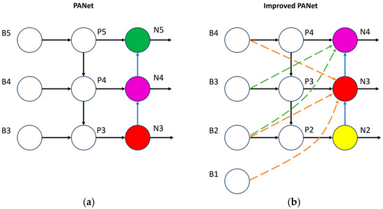 During the image feature extraction process within the backbone, essential spatial details are primarily captured in the shallower layers of the network. YOLOv8’s backbone employs the CBS module to perform successive downsampling, ranging from 2 times to 32 times, resulting in a total of five feature maps of different resolutions. These are denoted as B1 (320 × 320), B2 (160 × 160), B3 (80 × 80), B4 (40 × 40), and B5 (20 × 20), respectively, as depicted in Figure 5a. However, excessive downsampling operations can lead to significant data loss for small object detection. Therefore, in the design of LMRNet, we remove the last downsampling operations for generating B5, as illustrated in Figure 5b.