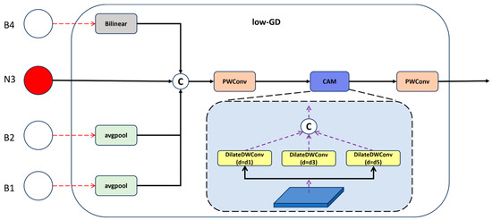 Low-stage gather-and-distribute module. The Low-GD module is employed to retain more low-level information by aggregating and fusing the B1, B2, and B4 features output from the backbone network, ultimately obtaining high-resolution features that preserve small target information. As depicted in Figure 8, the input multi-scale features are first aligned by downsampling the larger-scale B1 and B2 features through average pooling and upsampling the B4 feature through bilinear interpolation, adjusting them to the same scale as the N3 feature. The aligned features are then concatenated along the channel dimension and fused through PWConv. Following this, a Context Augmentation Module (CMA) [22] is utilized to capture spatial features of different receptive field sizes and model the differences between objects and backgrounds in greater detail. This module consists of 3×3 depth-wise separable dilated convolutions (DilateDWConv) [23] with dilation rates of 1, 3, and 5. Finally, another PWConv is applied for fusion and output.