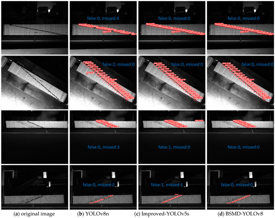 According to the results presented in Table 4, BSMD-YOLOv8 outperforms other models by achieving the highest accuracy (P), recall (R), and mAP50. Specifically, compared to Improved-YOLOv5s, BSMD-YOLOv8 exhibits an increase in accuracy and mAP by 0.4% and 0.1%, respectively, a reduction in parameters by 6.01M, and an improvement in FPS by 23 frames per second. Figure 10 provides a comparison of actual test results, revealing that the YOLOv8n model suffers from a higher number of missed detections and false detections, while Improved-YOLOv5s also exhibits some false detections. In contrast, the BSMD-YOLOv8 model demonstrates the best actual detection performance.