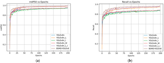 Figure 11 comprehensively displays the evaluation metrics of ablation experiment models over 200 training epochs, with a particular focus on mAP50 and Recall. In the initial stages, all models exhibit a steep surge in both mAP50 and recall, emphasizing the significant training effects achieved during this early phase. As the number of epochs progresses, the metrics gradually plateau, indicating convergence. Overall, the enhancement effect of using LMRNet as the backbone network in YOLOv8n (such as YOLOv8n_L, YOLOv8_L_I, BSMD-YOLOv8) is significantly more pronounced compared to the models that do not use LMRNet (such as YOLOv8n, YOLOv8_I, YOLOv8_W).