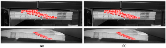 Comparison of detection results between YOLOv8_L_I and BSMD-YOLOv8: (a) YOLOv8_L_I (using CIoU); (b) BSMD-YOLOv8 (using WIoU).