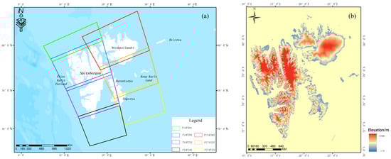 In this study, Sentinel-1 A/B ascending orbit data were collected from two tracks covering Svalbard from January to December 2021 for a total of seven maps, which could achieve full coverage of the land area of the archipelago. The spatial distribution of Sentinel-1 data is shown in