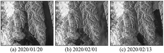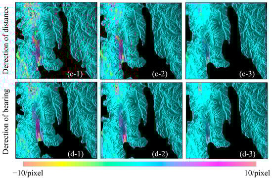 Figure 3(c-1–c-3,d-1–d-3) with a longer time interval (24 days) is relatively high, and the use of a larger cross-correlation window can no longer play a useful role in suppressing the noise. This is because due to the long time interval, the physical texture characteristics of surface features change greatly, which is does not allow us to carry out pixel offset calculation based on the cross-correlation strategy. Therefore, the selection of a time baseline needs to be reasonably made according to the specific conditions of glacier flow velocity in the monitoring area. In