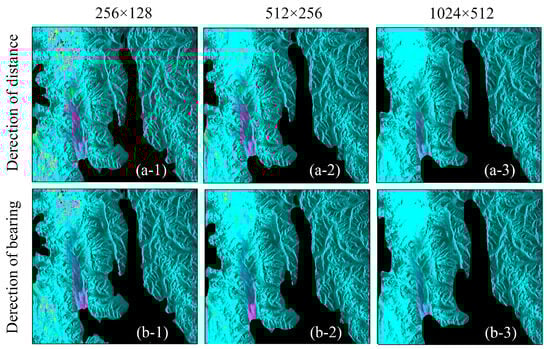 According to the principle of the POT technique, the cross-correlation coefficient of the center pixel of the template window is related to the size of the window and the intensity value of each pixel in the window. Therefore, it is necessary to compare and optimize the window size, and then balance the monitoring accuracy and noise suppression of the surface flow velocity of the POT glacier. Three sizes of cross-correlation windows of 1024 × 512, 512 × 256, and 256 × 128 are selected for offset calculation, and we obtained the offsets of the two image pairs in
