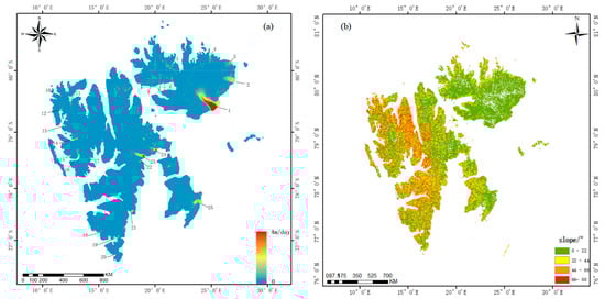 Figure 4b shows the slope of Svalbard. According to terrain slope and flow velocity information, glacier motion can be divided into four types, namely, gravity flow, extrusion flow, blocked gravity flow, and blocked extrusion flow. Gravity flow refers to the flow caused by the component force of glacier gravity along the slope, which is greater than the resistance of the glacier bottom to the glacier. It is the basic movement form of mountain glaciers with large slopes. When the movement is preceded by protruding bedrock or large, slow-moving ice blocks, the shear stress system of the glacier becomes press-forward and press-backward, where many thrust faults and complex folds occur, which block the gravity flow. Extrusion flow is the movement of glaciers caused by unbalanced forces due to the uneven thickness of glaciers. Similarly, when confronted with a protruding bedrock or a large, slow-moving ice block in front of it, it creates a blocking extrusion flow similar to blocking gravity flow.