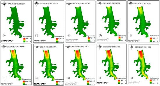 Figure 5 shows the cumulative displacement of the Monacobreen glacier obtained by processing Sentinel-1 data in 2021 using the time-series POT technique with a time interval of 36 days.