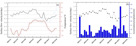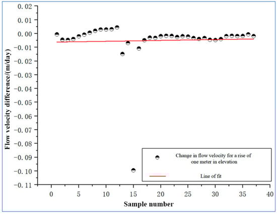 Table 5. It can be seen that generally, the larger the elevation difference, that is, the larger the slope, the larger the surface flow velocity difference. The maximum elevation increase is 48.9 m, and the corresponding flow velocity difference is also the largest, decreasing by 0.14 m/day.