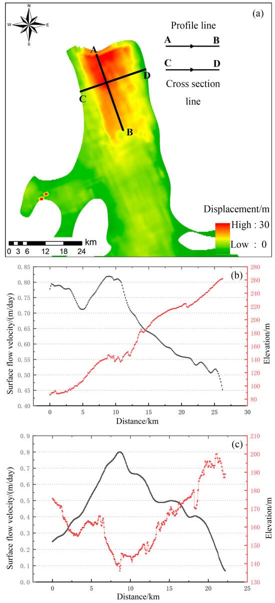 on the transverse section line indicate a significant negative correlation between glacier flow velocity and surface elevation.