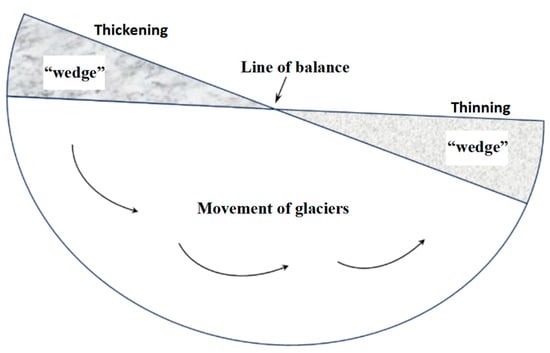 34]. The upstream material accumulation thickening and the downstream material loss thinning of the levering glacier occur during the quiet period. This requires a large glacier flow rate to maintain the material budget of the ice body. A similar effect of temperature and snowfall on glacier flow is to change the mass balance gradient of the glacier. In summer, glacial meltwater reduces the total glacier accumulation, decreases the glacier shear stress, and reduces the glacier flow velocity. If the effect of temperature on glacier viscosity, water pressure, and other factors is greater than the effect of decreasing the mass balance gradient, the glacier will show a phenomenon of a higher summer flow velocity. When strong ablation is encountered, the glacier retreats, the accumulation is greatly reduced, the bottom shear stress is sharply reduced, and the glacier flow speed is slow. Other factors are not enough to compensate for this effect, and the phenomenon of summer flow speed reduction will occur. Similarly, in the unusually snowy winter, a huge amount of glaciers accumulate, the ice layer becomes thicker, the shear stress of the bottom surface increases, and the glacier flow velocity may also suddenly increase.