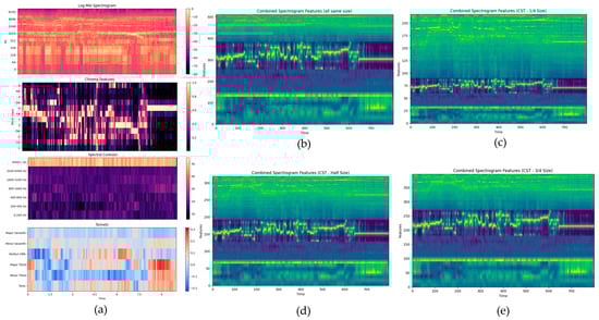 (a) From top to bottom: Log-Mel Spectrogram shows frequency (Hz) over time, where brighter regions represent higher intensity in decibels (dB). Chroma Features capture pitch class profiles (C, C#, D, D#, etc.), with “#” indicating a sharp note in musical notation. Spectral Contrast represents the difference in intensity between spectral peaks and valleys across frequency bands (e.g., 6400+ Hz to 200–400 Hz), providing complementary information to the Log-Mel Spectrogram. Tonnetz encodes harmonic relationships such as tonic, minor third, major third, perfect fifth, minor seventh, and major seventh, which represent musical intervals over time. (b) Combined Spectrogram Features (all same size), (c) Combined Spectrogram Features (CST—1/4 Size), (d) Combined Spectrogram Features (CST—Half Size), and (e) Combined Spectrogram Features (CST—3/4 Size) illustrate normalized feature values scaled between 0 and 1, where brighter colors indicate values closer to 1, and darker colors indicate values closer to 0. This normalization ensures consistent visualization despite differences in the original scales (e.g., frequency reaching 8192 Hz in Log-Mel, compared to the Tonnetz scale with a maximum value of 6 (Major Seventh)).