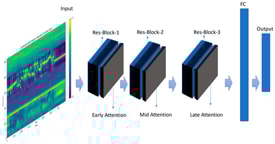 However, the increased number of spectrogram features can introduce challenges, making it difficult for the model to determine which part of the input image is the most important. Attention mechanisms help the model focus on the most relevant spectrogram features, addressing this issue. Some studies, like those on bird sound recognition [] and music annotation [], integrate attention mechanisms [,] to enhance the model.