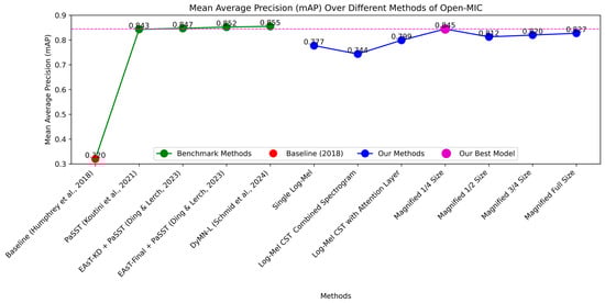 Among these, the “Magnified 1/4 Size” model achieved a mAP of 0.8445, demonstrating a performance close to the leading benchmark methods. This model’s success highlights the importance of carefully scaling the spectrogram features and incorporating attention mechanisms to enhance the model’s focus on the most informative parts of the input data. The magenta marker and horizontal magenta line on the graph emphasize the noteworthy performance of this model, illustrating the potential effectiveness of our approach in musical instrument recognition tasks.