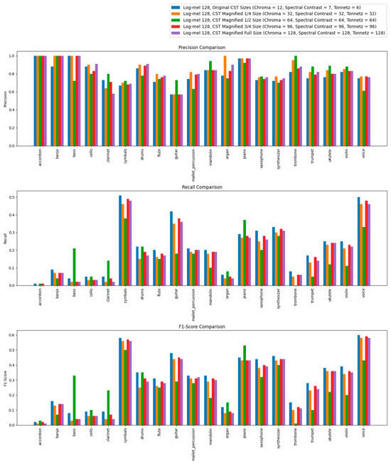 The models compared include configurations such as Log-Mel 128 with Original CST Sizes (Chroma = 12, Spectral Contrast = 7, Tonnetz = 6), Log-Mel 128 with CST Magnified to 1/4 Size (Chroma = 32, Spectral Contrast = 32, Tonnetz = 32), Log-Mel 128 with CST Magnified to 1/2 Size (Chroma = 64, Spectral Contrast = 64, Tonnetz = 64), Log-Mel 128 with CST Magnified to 3/4 Size (Chroma = 96, Spectral Contrast = 96, Tonnetz = 96), and Log-Mel 128 with CST Magnified to Full Size (Chroma = 128, Spectral Contrast = 128, Tonnetz = 128). Each sub-plot within the figure illustrates a specific metric comparison, with the top plot showing precision comparison, the middle plot showing recall comparison, and the bottom plot showing F1 score comparison.