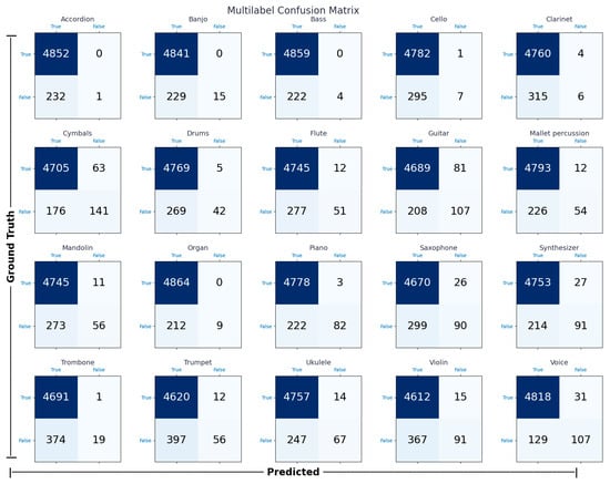 Multilabel confusion matrices for the best-performing model on each instrument. The rows represent the ground truth labels, while the columns indicate the predicted classifications. The matrices display true positives, true negatives, false positives, and false negatives for every instrument classification. Darker shades represent higher values, illustrating areas of strong classification accuracy and confusion points between certain instruments.