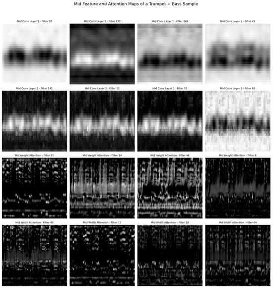 Mid-level feature and attention maps for a trumpet and bass sample, capturing intermediate representations with heightened detail through the combination of Log-Mel spectrogram and CST features at 1/4 scale. The mid layers reveal more refined frequency and harmonic structures, enhancing the model’s ability to distinguish between complex timbral characteristics. The grayscale shades represent values in the feature maps and attention maps, where darker shades indicate lower values, and lighter shades indicate higher values, providing a visual representation of the extracted features.