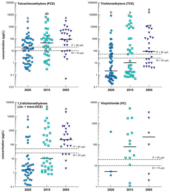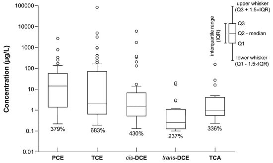 3.1. Occurrence of Chlorinated Hydrocarbons and Their Spatial Distribution in Groundwater