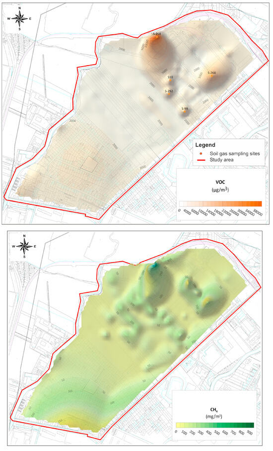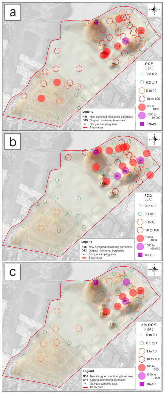 3.2. Spatial Distribution of VOC Concentrations in Soil Gas and Its Relation to Groundwater Contamination with CLHCs