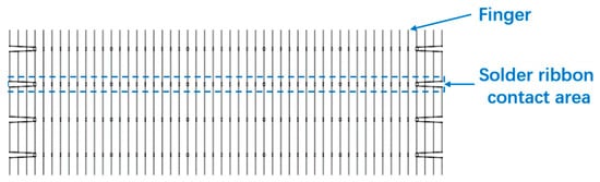 where Rcon is the contact resistance between the solder ribbon and finger; Rline is the solder ribbon resistance, which is obtained using Equation (2); and n is the number of fingers. R1, Rline, and Rfig are obtained using our test method, and Rcon is obtained using Equation (1).