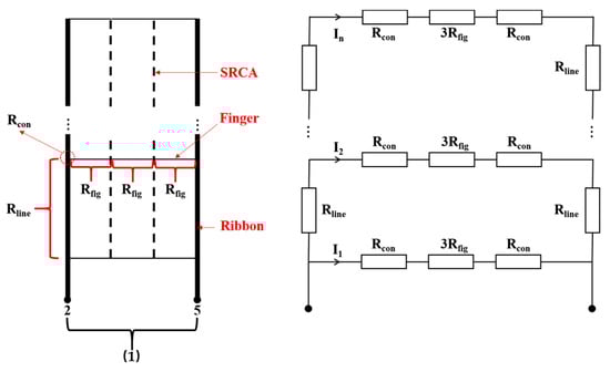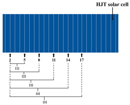Contact resistance test: As shown in Figure 5, probes need to be fixed onto two SRCAs; thus, by taking the 2nd SRCA as the fixed probe and connecting the other probe to the 5th, 8th, 11th, 14th, and 17th SRCAs, five resistance values were obtained. The five resistance values were plotted against the corresponding SRCA numbers between the probes, linear fitting was performed, and the finger resistance Rfig was obtained from the slope of the fitting line. After soldering or IFC, the resistance was obtained by clamping probes onto the solder ribbons. A probe was fixed at the 2nd solder ribbon, whereas the other probe was connected to the 5th, 8th, 11th, 14th, and 17th solder ribbons, and the resistance of area (1) was obtained as R1, the resistance of area (2) was obtained as R2, etc. Taking the tested area (1) as an example, the equivalent circuit for R1 is shown in Figure 6, and it is obtained using Equation (1).