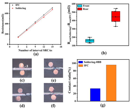 For this test, cells with pattern 1 and φ0.25 mm solder ribbons with Bi14 were applied in the soldering-based samples, while cells with pattern 2 and φ0.25 mm solder ribbons with Bi26 were applied in the IFC-based samples. Both the soldering-based 0BB sample and IFC-based 0BB sample were tested for their contact resistances using the method above, and the fitting lines are shown in Figure 7a. The two lines have similar slopes, indicating similar finger resistance Rfig values. Furthermore, the contact resistances of the laminated/soldered sample were tested. The Rcon value in test area (1) was calculated by inserting the values of Rfig, R1, and Rline into Equation (1), and the Rcon values in test areas (2), (3), (4), and (5) were similarly obtained. The IFC-based samples showed a lower Rcon than the soldering-based samples. The resistance differences between the soldering-based samples and IFC-based samples are displayed in Figure 7b, which shows that the average Rcon values of the soldering-based samples were 161 mΩ (front surface) and 444 mΩ (rear surface) higher than those of the IFC-based samples. Cross-sectional images of the TCO–solder-ribbon contact (Figure 7c–f) reveal both complete and incomplete contacts in the IFC and soldering-based samples. Statistical analysis (Figure 7g) indicates a higher probability of incomplete contact between solder and TCO in soldering-based samples, explaining the higher contact resistance. This may be because alloying occurs during the lamination process under 1 bar of pressure for IFC-based modules, resulting in improved wetting and contact between the solder and the TCO surface. In contrast, ribbons in soldering-based modules rely only on fixture pressure, likely resulting in incomplete contact with the TCO. The higher contact resistance of soldering-based samples will further lead to the higher Rs of modules.