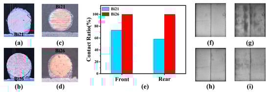 Cross-section of finger–solder-ribbon contact in IFC-based process: (a) Bi21 and (b) Bi26. Cross-section of TCO–solder-ribbon contact in IFC-based process: (c) Bi21 and (d) Bi26. (e) The ratio of contact between TCO and Bi21/Bi26 solder ribbons. EL images of the Bi21 sample: (f) initially and (g) after baking. EL images of the Bi26 sample: (h) initially and (i) after baking.