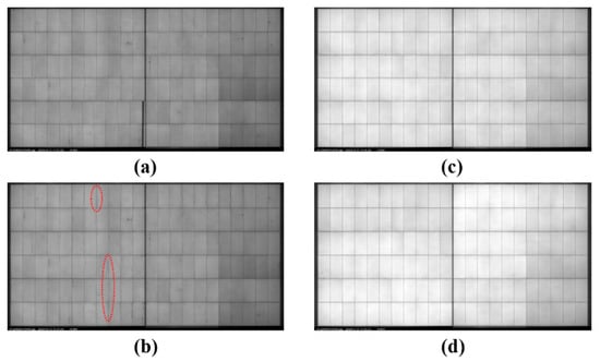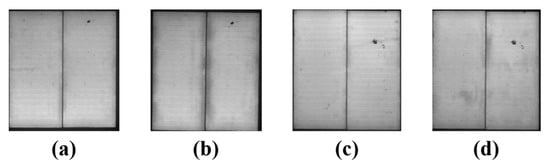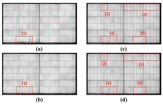 EL images of soldering-based 0BB modules: (a) initially with Ag@Cu paste, (b) after HF20 with Ag@Cu paste, (c) initially with silver paste, and (d) after HF20 with silver paste.