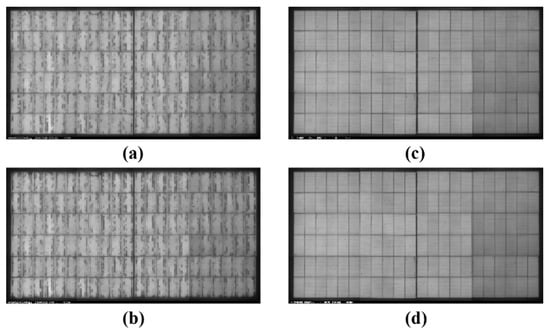 EL images of IFC-based 0BB modules: (a) initially with silver paste, (b) after TC200 with silver paste, (c) initially with Ag@Cu paste, and (d) after TC200 with Ag@Cu paste.
