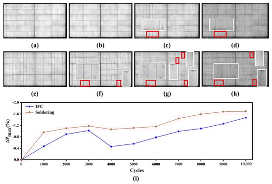 IFC-based 0BB module EL images: (a) initially, (b) T-DML1000, (c) T-DML1000×6, and (d) T-DML1000×10. Soldering-based 0BB module EL images: (e) initially, (f) T-DML1000, (g) T-DML1000×6, and (h) T-DML1000×10. (i) The change in power in T-DML1000×10.