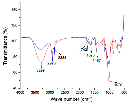 The bands appearing between 1500–500 cm−1 are the products of several types of bond vibrations, which is why it is often difficult to assign their origin to a particular band. In addition, these bond vibrations originate from a strong interaction between neighboring bonds. This complex region is often known as the fingerprint and can vary from one subsample to another [102]. However, characteristic bands of certain families of compounds can be identified. In this case, a high band between 1100 and 1000 cm−1 is commonly associated with the presence of complex carbohydrates (cellulose) [102], which was observed in the samples from the present study (Figure 1).