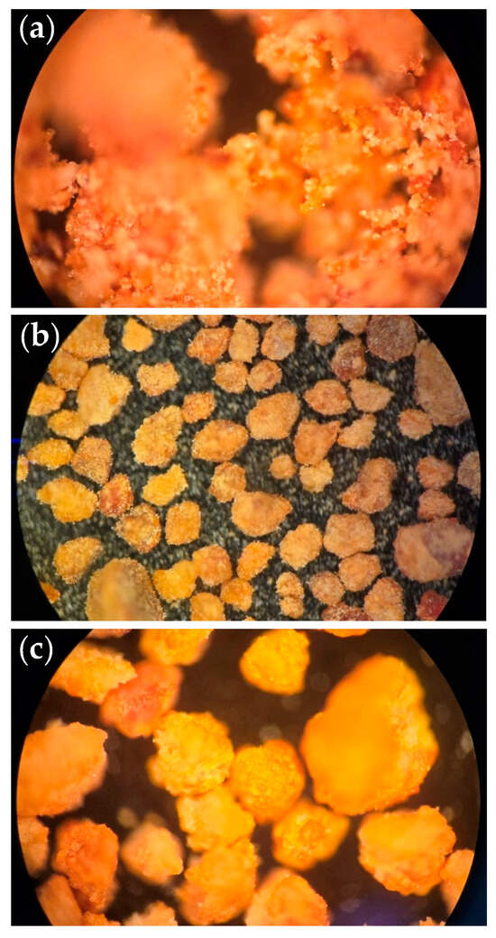 After the pretreatments, changes in the architecture of the material were visually evident (Figure 2). The untreated bio-adsorbent (Figure 2a) shows agglomerations and a low contact surface. In addition, the material’s color has an orange tone, probably due to the presence of lipids in the material. In the case of the bio-adsorbent pretreated with ethanol, a change in the architecture is notable (Figure 2b): the bio-adsorbent particles are looser, and their color is less orange. The degreasing ethanol’s capacity may allow a change in the structural conformation of the individual particles. In the case of the bio-adsorbent pretreated with ethylene glycol (Figure 2c), it could be said that it is intermediate in architecture between the two previous ones because although its particles are loose, they do not present the same distribution as those corresponding to the pretreatment with ethanol. As for the color, although the orange has been somewhat lost, it does not reach the tone of the bio-adsorbent pretreated with ethanol. Because ethylene glycol is non-polar and is not considered a degreaser, it cannot eliminate the lipid content of the material.