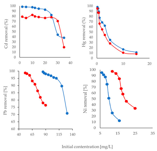 Removal percentages for initial concentrations of Cd, Hg, Pb, and Ni pretreated with ethanol (blue) and ethylene glycol (red).