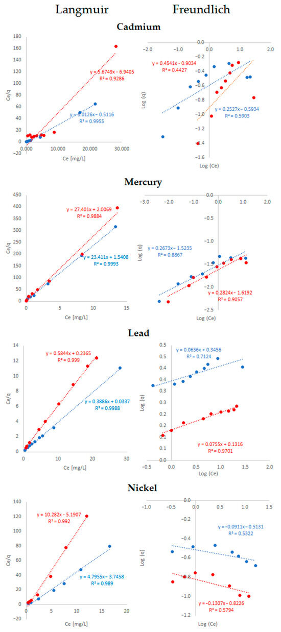 The Langmuir and Freundlich isotherm models were applied in the present study (Table 3). For the Langmuir model, adsorbents with the highest possible qm and a high value of KL are the most desirable for their use in metal sequestration [83].