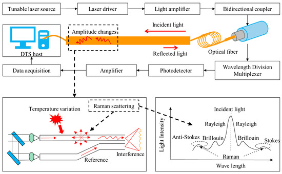 The DTS system is designed to monitor the temperature inside mass concrete structures by utilizing the principles of Raman scattering and time-domain reflection of light within an optical fiber [36]. This system is characterized by its ability to provide real-time, online, and continuous monitoring of the internal temperature distribution within concrete. DTS technology has been extensively employed in various concrete structures, including dams, roads, and bridges [37]. Compared to the conventional digital thermometer method, DTS temperature measurement technology offers significant advantages, such as continuous monitoring, high spatial resolution, and long-distance coverage [38]. The temperature measurement principle and components of a typical DTS system are shown in Figure 1.