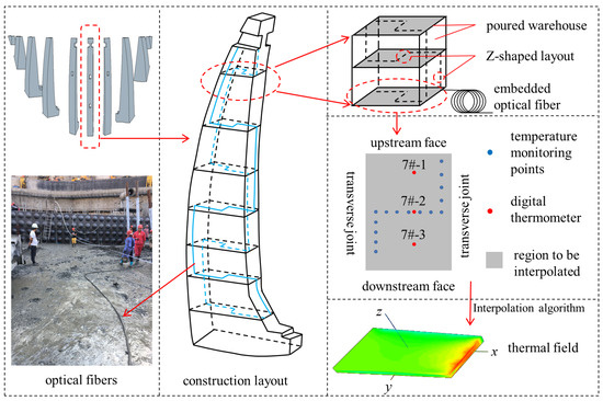 The minimum data acquisition interval of the DTS system used in this study is 10 s, allowing for continuous monitoring of the internal temperature of the concrete. The spatial and temperature resolutions of the DTS system were 1.02 m and 0.5 °C, respectively. By setting the temperature of upstream and downstream surfaces to ambient temperature, a two-dimensional (2D) thermal field can be interpolated. Then, a three-dimensional (3D) thermal field can be constructed when combining all adjacent 2D thermal fields. As the temperature of the monitoring points keeps being updated, the real-time thermal field of the whole dam can be obtained. Since optical fiber embedding and concrete pouring occur synchronously, the thermal field digitized via interpolation algorithm analyses can concur with the construction progress.
