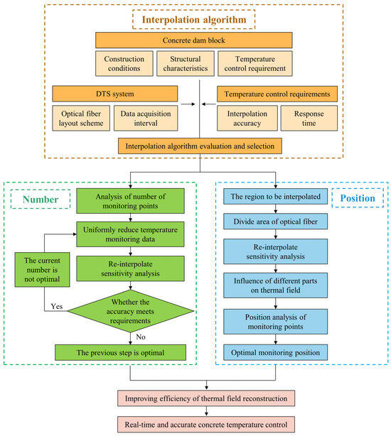 The optimization method proposed in this study, as illustrated in Figure 3, comprises three key components: interpolation algorithm evaluation and selection, optimization of the number of monitoring points, and analysis of the impact of monitoring positions. Initially, the optical fiber layout scheme is determined based on actual construction conditions. This step is primarily influenced by the constraints of construction organization, structural characteristics, and temperature-control requirements. Next, for the specific structure of concrete dam blocks, an analysis of the applicability and accuracy of interpolation algorithms is condupcted. Following this, a sensitivity analysis of the number and positions of monitoring points is performed, guided by the selected interpolation algorithm and optical fiber layout scheme, to inform the selection of monitoring data.